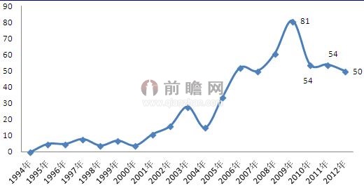 圖表1:1994-2012年我國外診斷行業(yè)專利申請量(單位:件)